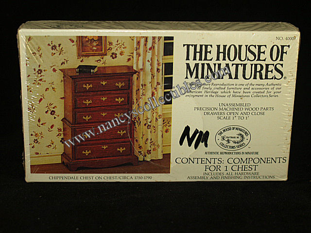 A miniature reproduction of a Chippendale Chest on Chest(ca.1750-1790) kit #40009 by The House of Miniatures. It is in excellent condition in an unopened box. It includes precision machined wood parts, drawers open and close, all hardware, as- sembly and finishing instructions. Scale is 1" to 1'. It is dated 1976.