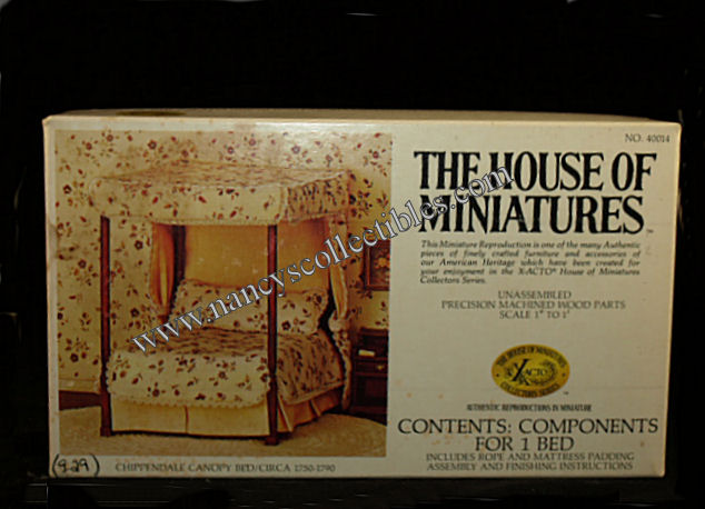 A miniature reproduction of a Chippendale Canopy Bed (ca.1750-1790) kit #40014 by The House of Miniatures. It is in excellent condition in original box. Scale is 1" to 1'. It includes precision machined wood parts, rope, mattress padding, and all assembly and finishing instructions. It is dated 1976.