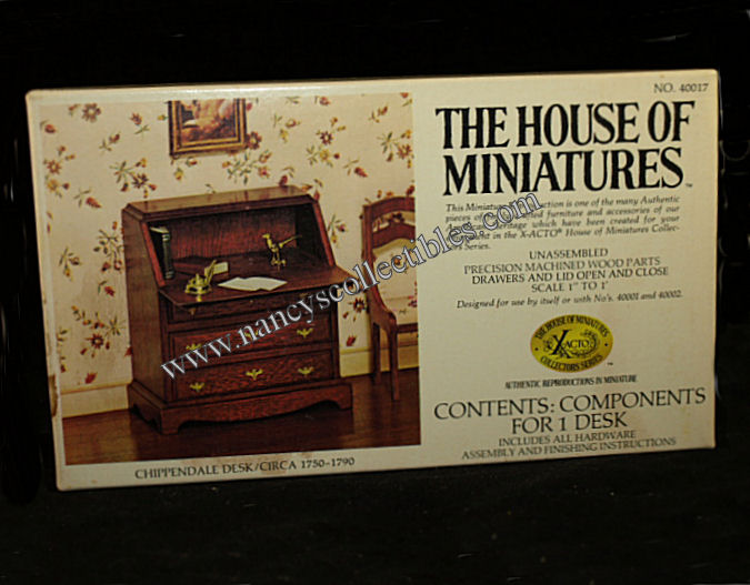A miniature reproduction of a Chippendale Desk (ca.1750-1790) kit #40017 by The House of Miniatures. It is in excellent condition in the original box. Scale is 1" to 1'. It includes precision machined wood parts, drawers and lid open and close, all hardware assem- bly and finishing instructions. It is designed for use by itself or with No.'s 40001 and 40002. It is dated 1976.