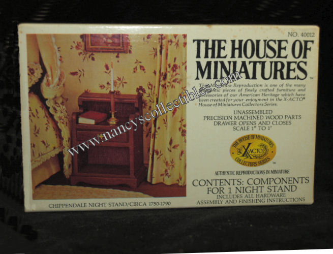 A miniature reproduction of a Chippendale Night Stand (ca.1750-1790) kit #40012 by The House of Miniatures. It is in excellent condition in original box. Scale is 1" to 1'. It includes precision machined wood parts, drawer opens and closes, all hardware as- sembly and finishing instructions. It is dated 1976.