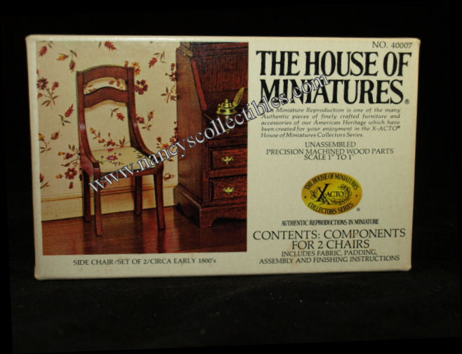A miniature reproduction of a set of 2 Side Chairs (ca.early 1800's) kit #40007 by The House of Miniatures. It is in ex- cellent condition in original box. Scale is 1" to 1'. It includes precision mac- hined wood parts, fabric, padding, and all assembly and finishing instructions for two chairs. It is dated 1976.