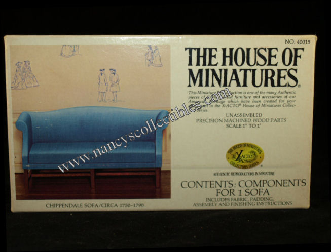 A miniature reproduction of a Chippendale Sofa (ca.1750-1790) kit #40015 by The House of Miniatures. It is in excellent condition in original box. Scale is 1" to 1'. It includes precision machined wood parts, fabric, padding, and all assembly and finishing instructions. It is dated 1976.