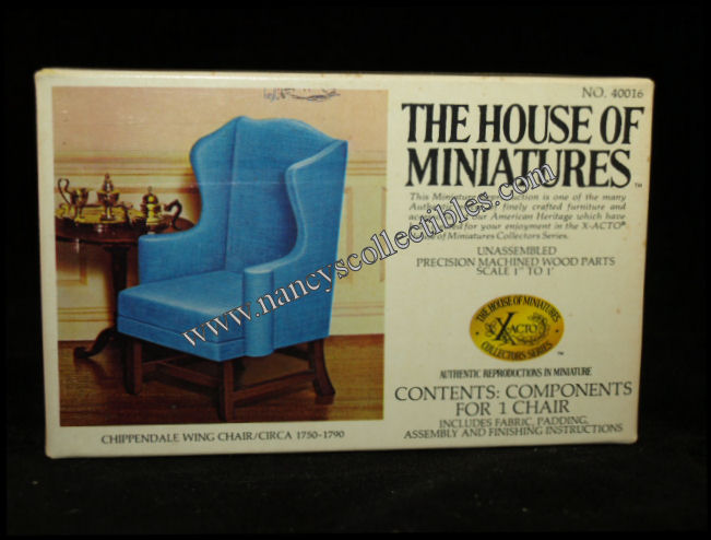 A miniature reproduction of a Chippendale Wing Chair (ca.1750-1790) kit #40016 by The House of Miniatures. It is in excellent condition in original box. Scale is 1" to 1'. It includes precision machined wood parts, fabric, padding, and all assembly and fin- ishing instructions. It is dated 1977.