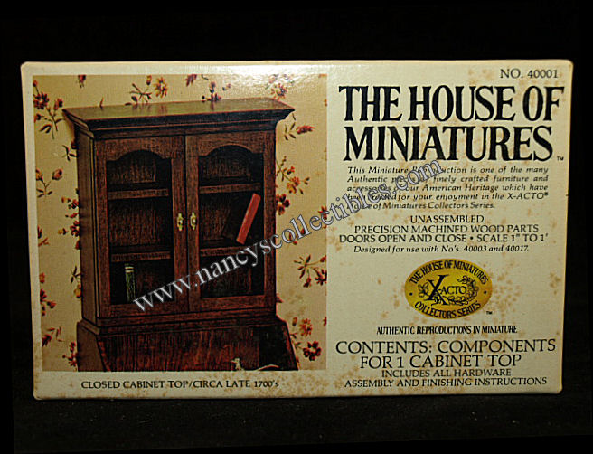 A miniature reproduction of a Closed Cabinet Top (ca. late 1700's) kit #40001 by The House of Miniatures. It is in excellent condition in original box. Scale is 1" to 1'. It includes precision machined wood parts, drawer & doors open & close, all hardware, assembly and finishing instructions. It is designed for use with No.'s 40003 and/or 40017. It is dated 1976.