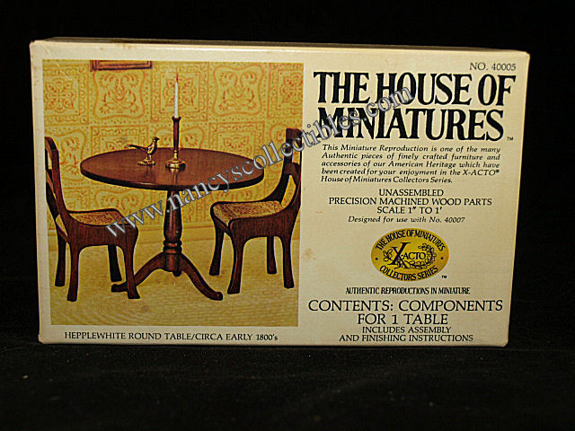 A miniature reproduction of a Hepplewhite Round Table (ca.early 1800's) kit #40005 by The House of Miniatures. It is in ex- cellent condition in original box. Scale is 1" to 1'. It includes precision machined wood parts and assembly and finishing instructions. It is dated 1976.