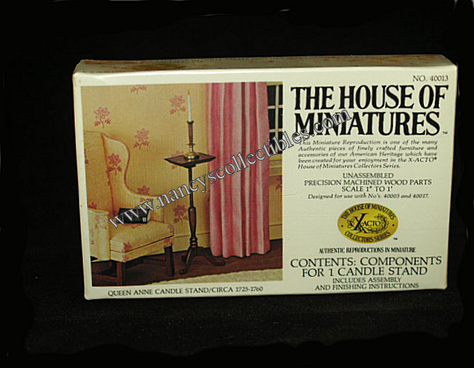 A miniature reproduction of a Queen Anne Candle Stand (ca.1725-1760) kit #40013 by The House of Miniatures. It is in excellent condition in an unopened box. It includes precision machined wood parts and assembly and finishing instructions. Scale is 1" to 1'. It is dated 1976.