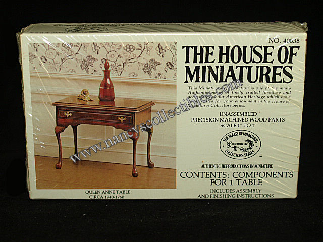 A miniature reproduction of a Queen Anne Table (ca.1740-1760) kit #40038 by The House of Mini- atures. It is in excellent condition in an unopened box. It includes precision machined wood parts and assembly and finishing instructions. Scale is 1" to 1'. It is dated 1977.