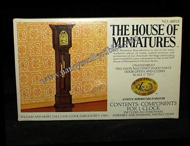 A miniature reproduction of a William and Mary Tall Case Clock (ca.early 1700's) kit #40018 by The House of Miniatures. It is in excellent condition in original box. Scale is 1" to 1'. It includes precision machined wood parts, door opens and closes, and all hardware, assembly and finishing instructions. It is dated 1976.