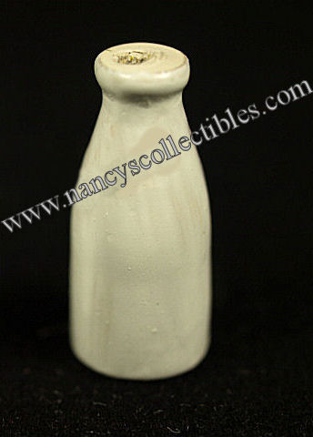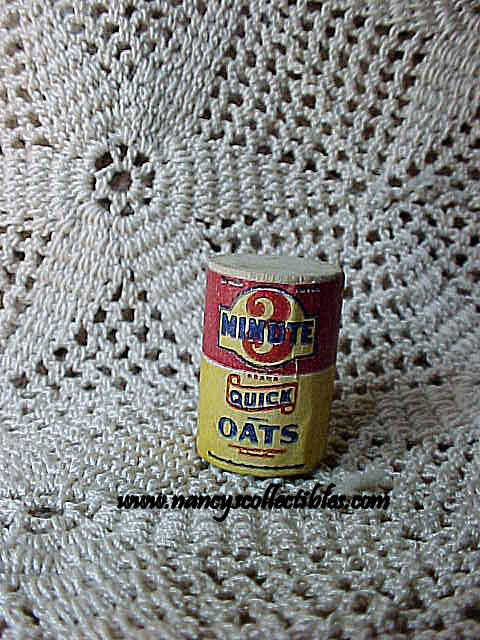 A miniature 3 Minute Oatmeal-Quick Oats box and a milk bottle to go with it. The oatmeal box is red and yellow with dark blue text. The directions and nutritional information are printed on the back(some not readable). It measures 1/2" in di- ameter, 3/4" tall. It is in excellent condition. The milk bottle is wooden, and is painted white. It measures 3/4" tall.