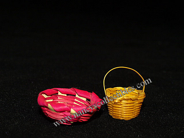This is a pair of miniature baskets. One is a red, round basket and the other is a handled natural straw basket. The round basket measures 1/2" tall; 1-1/4" wide. They are in excellent condition. The handled basket measures 1/2" tall; 3/4" wide. Both are unmarked.