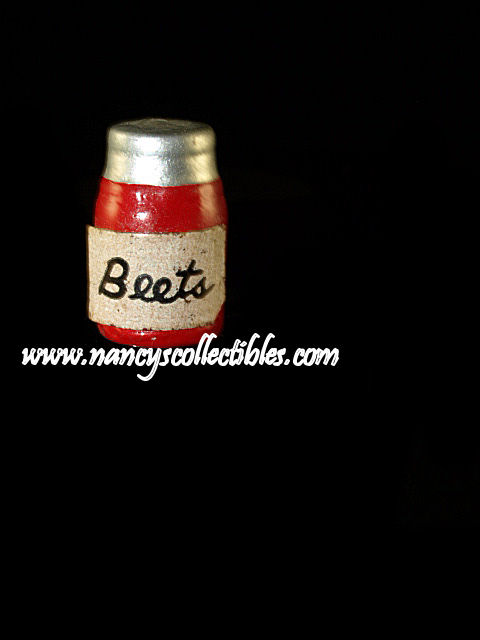 A miniature plastic jar painted red and silver to look like a jar of beets with a silver lid. The lid is not removeable. The label is marked "Beets". It is in excel- lent condition. It measures 1/2" tall; 1/4" wide.