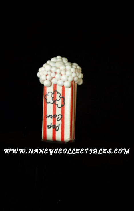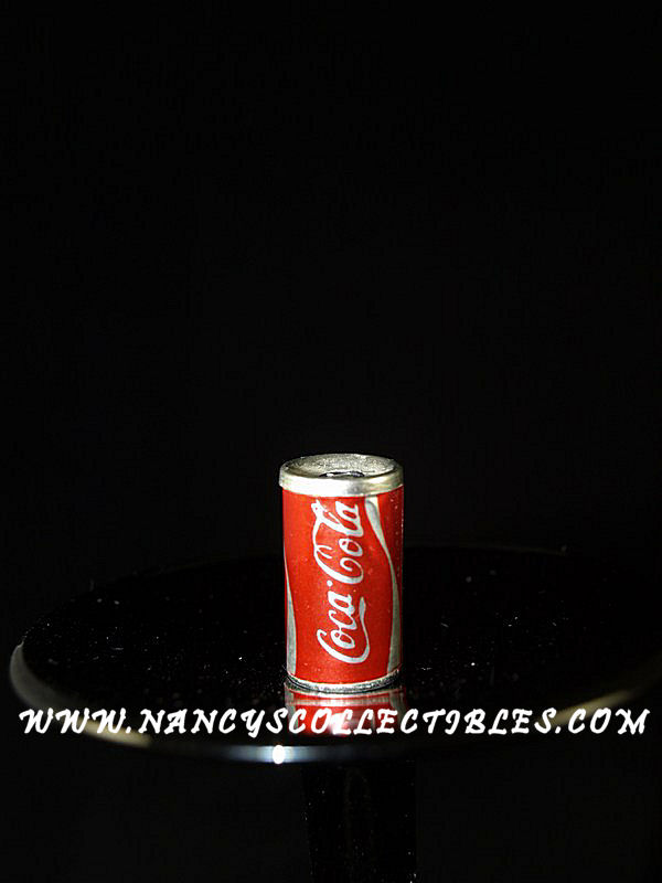 A miniature Coca Cola can. It has the "Coca Cola" emblem along with "Coke" on the side of the can. It appears to be made out of aluminum. The poptop has been removed, if it was ever there. It is in excellent condition. It mea- sures 7/8" tall; 1/2" wide. The box of popcorn is red and white striped with "Popcorn" written on one side of the box. It is in excellent condition. It measures 1-1/4" tall; 1/2" wide.