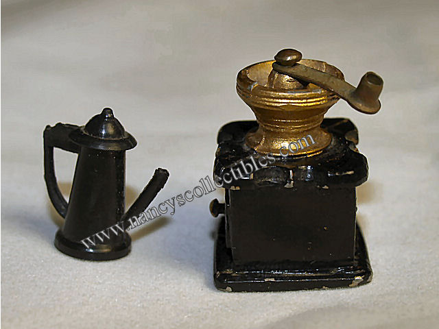 A miniature black metal and brass coffee grinder and black plastic coffee pot. The grinder handle does turn. The grinder has a few paint chips, but otherwise is in excellent condition. The coffee pot is in excellent con- dition. The grinder measures 1" tall; 3/4" wide. The pot measures 3/4" tall; 3/4" from handle to spout.