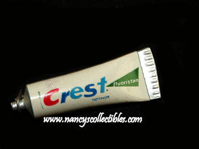 A miniature tube of Crest Toothpaste. Of course, there isn't any toothpaste in the tube, just a likeness of a tube of toothpaste. It is in excellent condition. It measures 1-1/2" long; 1/2" wide.