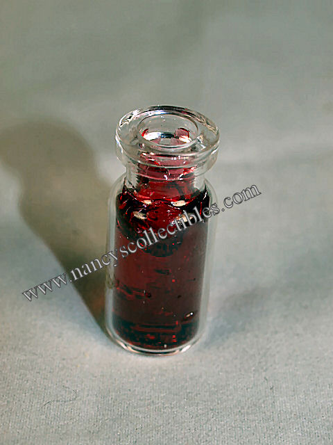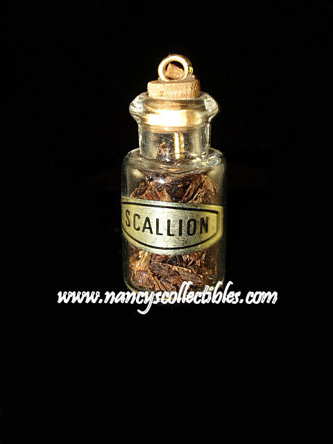 A miniature clear glass jar with a cork lid and a gold label marked "scallion". There is mini scallions or what appears to be mini scallions inside. It is in excellent condition. It measures 1" tall; 1/2" wide. The jam jar is missing a lid or its cork. There appears to be strawberry jam inside. It is in excellent condition. It measures 1-1/2" tall; 1/2" wide.