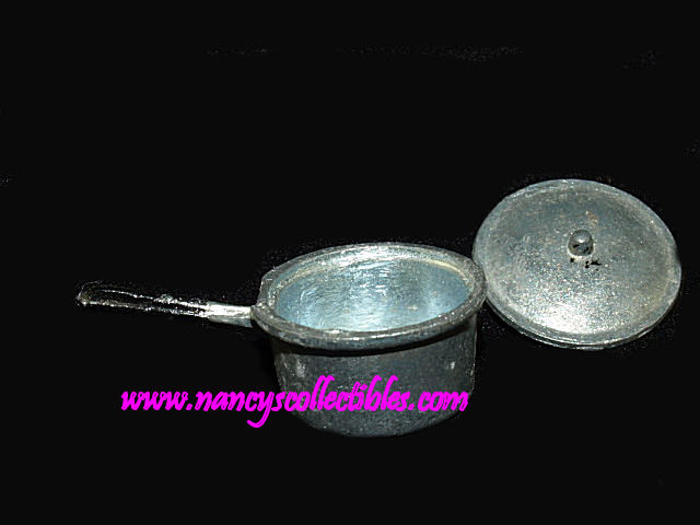 This is a miniature metal sauce pan and lid. It measures 1-3/4" long (including handle), 1" in diameter. They are in excellent condi- tion. They are unmarked.
