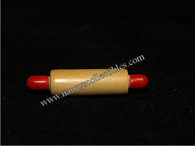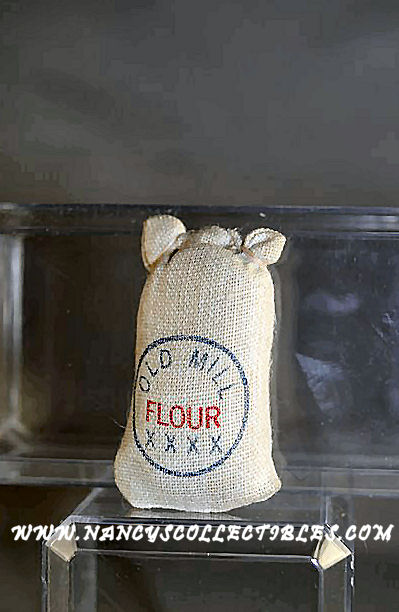 This is a miniature sack of flour. The sack is made of a cotton to simulate burlap. It does not, of course, hold real flour. It is in excellent condi- tion. It states on the sack, "Old Mill Flour". It measures 2" tall; 1" wide. The rolling pin is natural wood with red handles. It measures 1-1/2" long; 1/4" in diameter. Great additions to your dollhouse farmhouse.