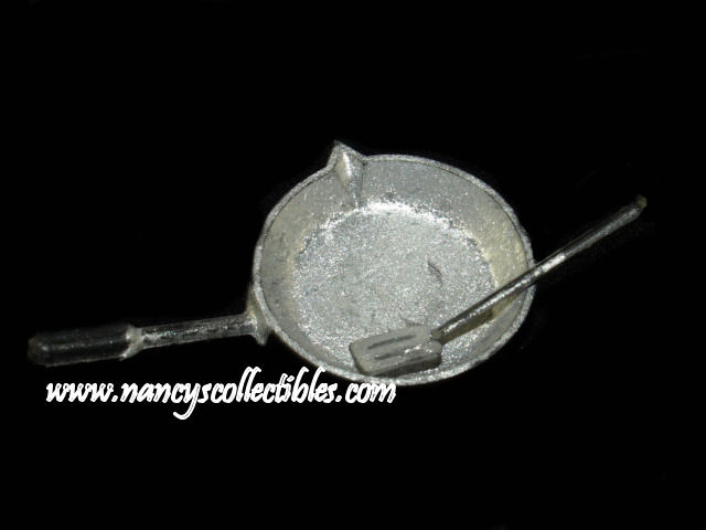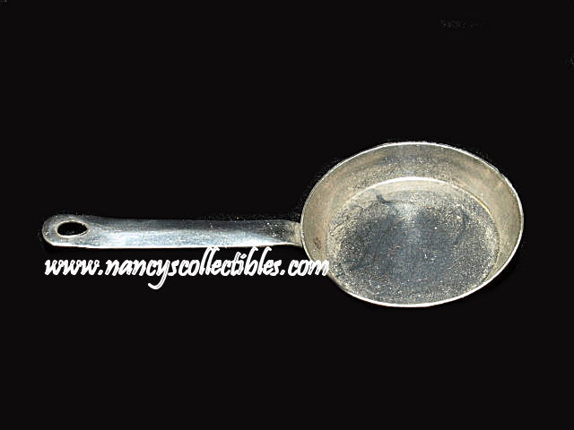 This is a miniature metal skillet. It measures 1-7/8" long (including handle), 1" in diameter. It is in excellent con- dition. It is unmarked.