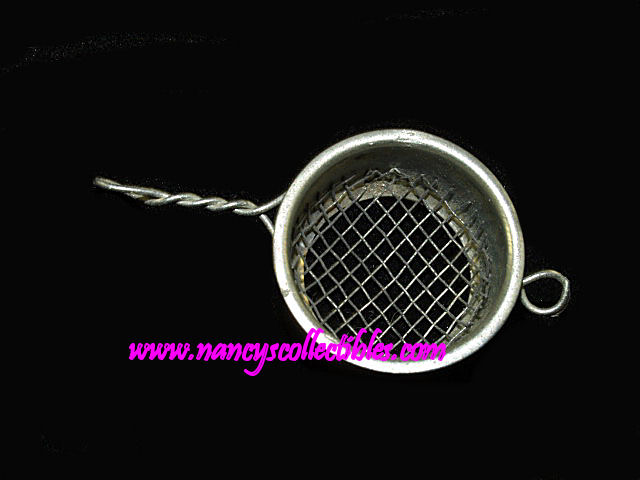This is a miniature metal strainer with a long twisted handle. It measures 2" long (including handle), 1" in diameter. It is in excellent condition. It is unmarked.