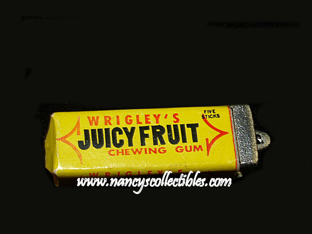 A miniature likeness of a package of Wrigley's Juicy Fruit Gum". It is in excellent condition. It measures 1-1/8" long; 3/8" wide.