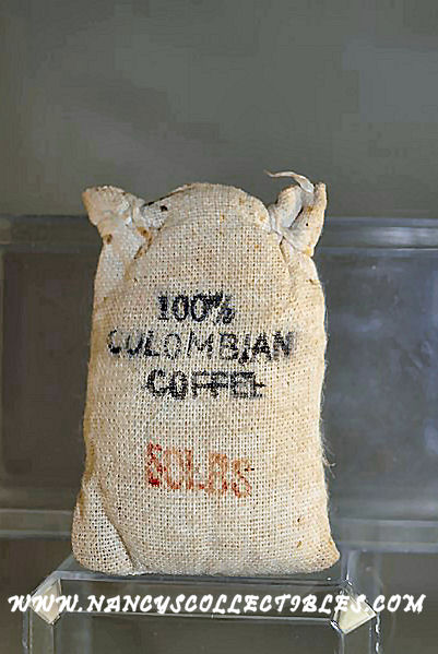 This is a miniature sack of 100% Columbian Coffee. This, of course, does not hold real coffee. The sack is made of a cotton to sim- ulate burlap. It is in excellent condition. It states on the sack, "100% Columbian Coffee, 80 lbs.". It measures 2" tall; 1-3/4" wide. The wood scoop measures 2-1/4" long; 3/4" wide. It also is in excellent condition. A great addition to your dollhouse farmhouse.