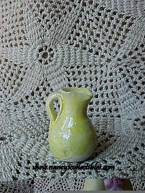A miniature yellow pottery pitcher. It looks to be homemade. It is in excellent condition, but due to the fact that it appears to be homemade, it is a little rough looking. It measures 3/4" tall; 1/2" in diameter.
