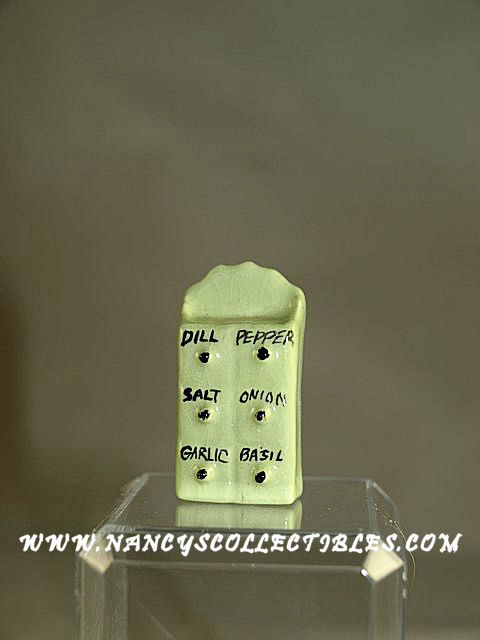 A miniature green pottery wall spice container. It has marked drawers. They do not open! There is a hole in the back for hanging in your dollhouse kitchen. It is in excellent condition. It measures 1-1/2" tall; 3/4" wide.