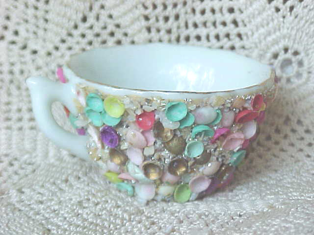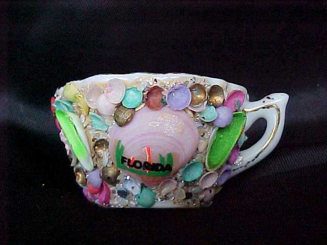 This is a miniature souvenir cup from Florida. It is decorated with mostly tiny seashells. There are a few larger shells, one of which has the word "Florida" written on it. The top edge and the handle is trimmed in gold. It measures 1" tall; 1-5/8" in diameter. It is not marked. It is in excellent condition; no cracks, chips or repairs.