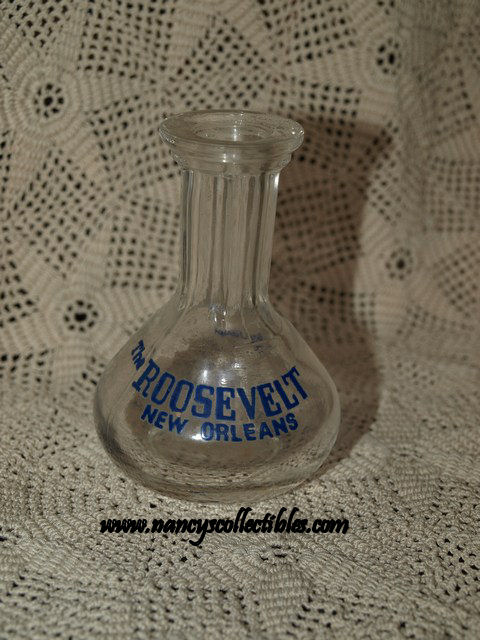 A miniature clear glass rum flask from The Roosevelt in New Orleans. It has "The Roosevelt, New Orleans, Rum" printed in blue. It is in excellent condition. It measures 3" tall; 2" in diameter.