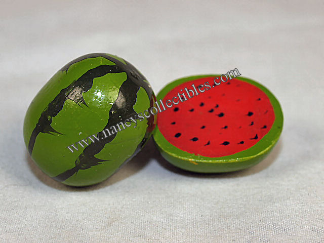 A miniature whole watermelon and a half watermelon. They are in excellent condition. The whole watermelon measures 1" long; 1/2" wide. The sliced watermelon measures 1" long; 3/4" wide.