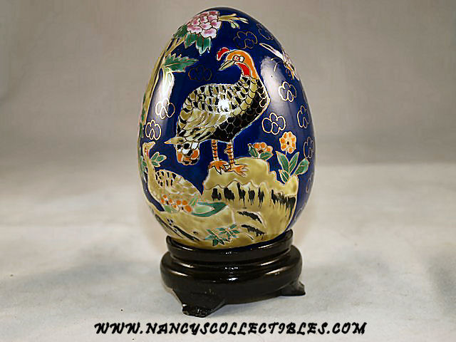 A beautiful porcelain cloissone egg. It is decorated with peacocks, butterflies, and flowers. It has a lapis blue background with pink flowers and gold. It is in excellent condition; no chips, cracks, or repairs. It is unmarked. It measures 4-1/4" tall; and approximately 3" wide. There are two available. Each is slightly dif- ferent. See pictures. Includes black lacquered stand.