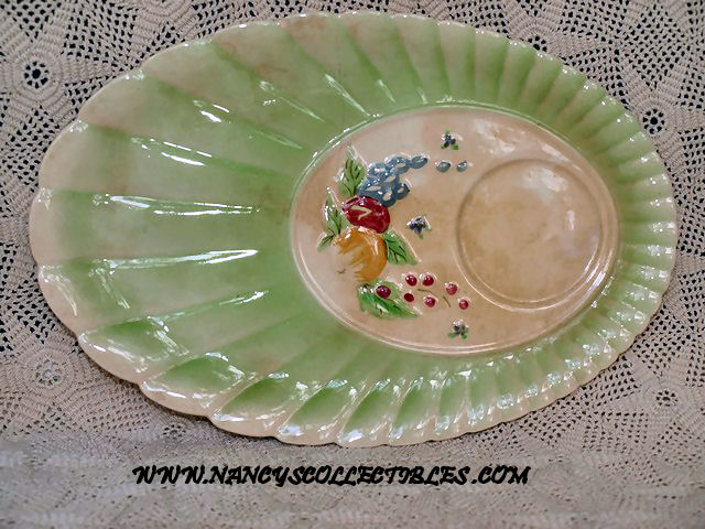 This is a luncheon plate by Brentleigh Ware, of Staffordshire, England. It is a pale green deco- rated with various fruits in a shell pattern. It is in very good condition. It does have overall crazing, one small paint chip, and a small hair- line. It is marked "Brentleigh ware,Staffordshire, England". It is oval and measures 9-1/4" long, 6-1/4" wide. It is dated 1950+.