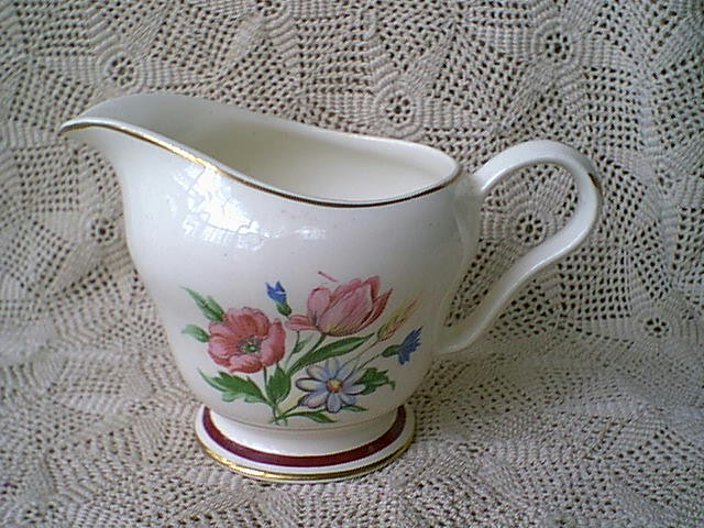 A very pretty china creamer in the "Dubarry" pattern. It is decorated with flowers and a maroon band at the base. It is decorated the same on both sides. The handles, top, and base are trimmed in gold. The measurements are 3-½" tall, 5 ½" wide. It is marked "Semi-vitreous, Edwin M. Knowles China Co.". It is in excellent condition; no chips, cracks, or hairlines.