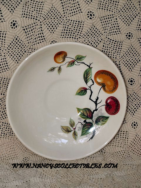 This is a saucer decorated with various fruits and leaves on a white background. It is in excellent condition; no chips, cracks, or repairs. It is un- marked. It is measures 5-1/2" in diameter.