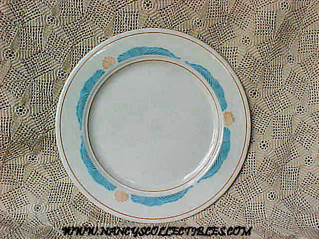 This is a very nice dessert/salad plate by Homer Laughlin. It is ivory, decorated with a peach shell design with a blue design on each side. The pattern name is "Seashell". It is in good condition; no cracks, hairlines, or repairs. It does have two chips on the back; one of which goes slightly to the front. It is marked "Homer Laughlin, Best China, U.S.A., CCE-1" with the Homer Laughlin logo in the center. It measures 8" in diameter; 3/4" tall. It is dated 1962.