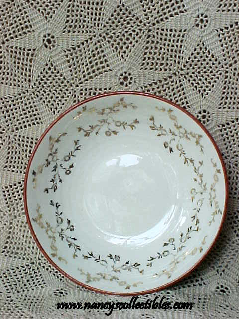 A beautiful bowl by James River Potteries. It is ivory, decorated with a design of gold flowers edged in brick red. It is in excellent condition; no chips, cracks or repairs. There is some crazing. It measures 5" in diameter. It is marked "JR,22 Karat,Golden Cascade". It is dated 1935.