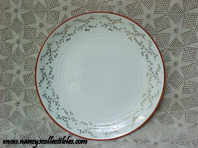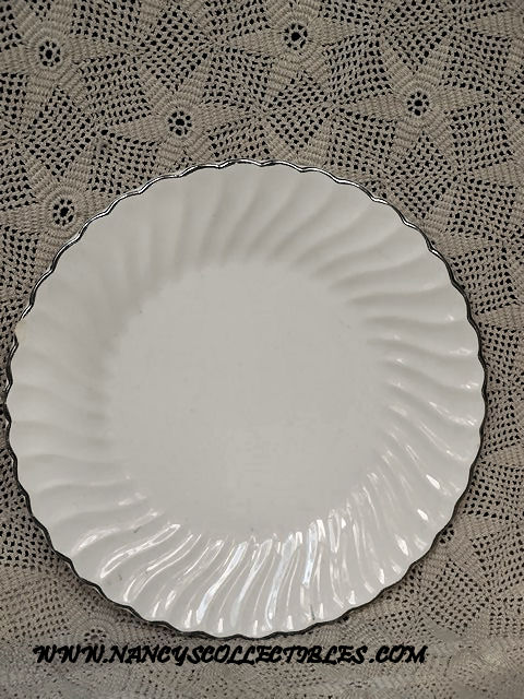 This is a white swirled dessert plate. It is trimmed in platinum. It is in very good condition; no repairs or cracks. It has one chip on the outside rim. It is unmarked. It is measures 7" in diameter.