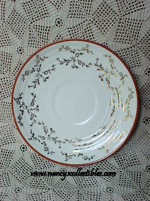 A beautiful saucer by James River Potteries. It is ivory, decorated with a design of gold flowers edged in brick red. It is in excellent condition; no chips, cracks or repairs. There is some crazing. It measures 5-3/4" in diameter. It is marked "JR,22 Karat,Golden Cascade". It is dated 1935.