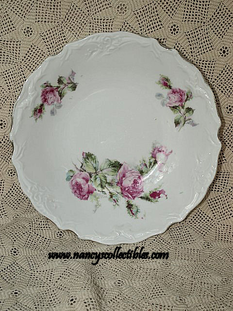 This is a very nice antique floral bowl. It is white with embossing and trimmed in gold around the outer edge, and decorated with pink roses and greenery. The rim follows the embossing. It is in excellent condition; no cracks, hairlines, or repairs. The gold trim is worn and there is a small amount of crazing/cracking in the glaze on the back. It does not go through the porcelain. It is unmarked. It measures 7-3/4" in diameter; 1-3/4" tall.