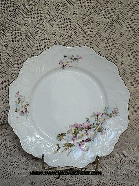 This is a very nice floral dessert/salad plate. It is white with embossing and trimmed in gold around the outer edge, and decorated with pink and white flowers and greenery. The rim follows the embossing. It is in excellent condition; no cracks, hairlines, or repairs. It is unmarked. It measures 8" in diameter; 1" tall.