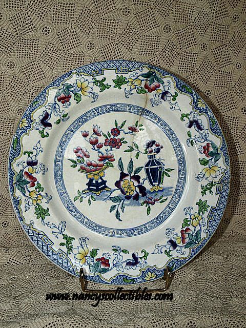 A dinner plate by Mintons in the pattern "Poonah". It has a white background with a blue lattice and floral rim and flowers and an urn in the center. It is in good condition. It has a chip on the back and two hairlines. It is marked "Mintons, England" and embossed with "Mintons, 7, 2, 26". It measures 9" in diameter. It is dated 1873+.