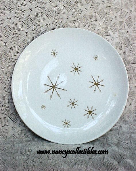 This is a dinner plate by Royal China Sebring, Ohio. The pattern is "Star Glow". It is decorated with mustard/gold stars. It is in excellent condition; no chips, cracks, or repairs. It is marked "Star Glow by Royal China,Sebring OH, Royal Ironstone". It measures 10" in diameter.