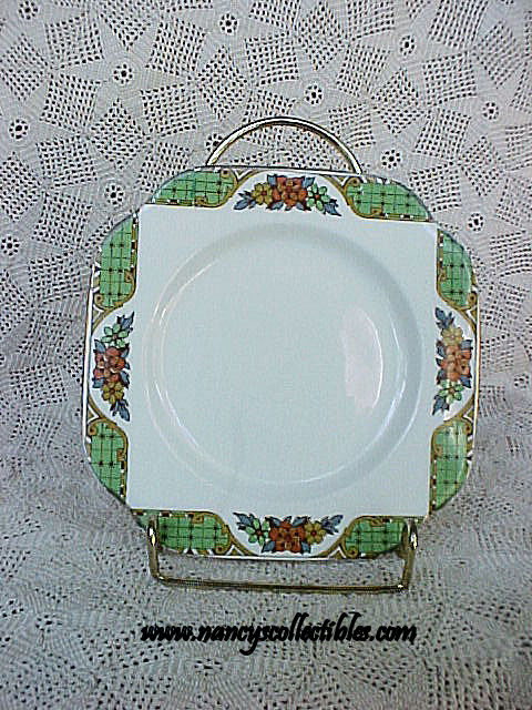 This is a very nice dessert plate by Morley, Fox, & Co., Ltd. It is white, bordered in green with a blue, rust, and tan floral design. It is trimmed in gold on the outer edge. The plate is square with curved corners. It is in good condition. It does have a hairline crack which goes to the front approximately 1-1/2" long. It is marked "England" with a vase and the letters "MF" in the center. It measures 5-1/2" wide. It is dated 1906.