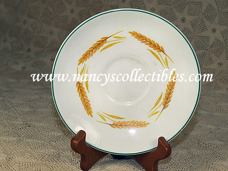 This is a saucer by Royal Tunstall Staffordshire of England. It is decorated with sprigs of wheat. The outer edge is decorated in green. It is in excellent condition; no chips, cracks, or repairs. It is marked "Royal Tunstall Staffordshire, Made in England". It measures 5-1/2" in diameter. It is ca. 1957+. I have 1 more, which has a chip. It is priced accordingly.