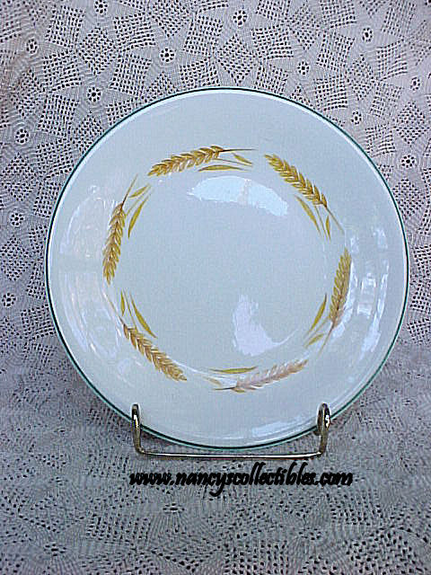 This is a salad plate by Royal Tunstall Staffordshire of England. It is decorated with sprigs of wheat. The outer edge is decorated in green. It is in excellent condition; no chips, cracks, or repairs. It is marked "Royal Tunstall Staffordshire, Made in England, 7, 60". It measures 7" in diameter. It is ca. 1957+. I have 5 more; 2 of which are in excellent condition and 3 that are chipped underneath. One has a tiny chip and the other 2 have a chip about 1/4"-1/2" wide. They are priced accordingly.