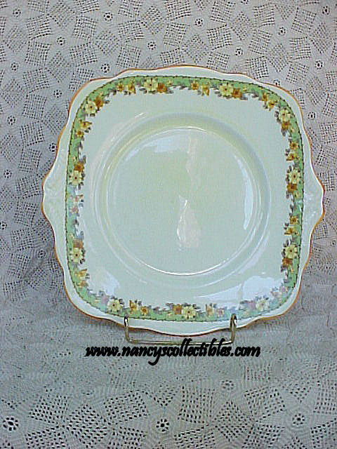 This is a very nice made in England dinner plate. It is white, bordered in green with yellow, rust, and orange flowers. It is trimmed in orange on the outer edge. The plate is square with scallops and curved corners. It is in excellent condition; no chips, cracks, or repairs. It does have a small scratch in the green border approximately 1/4" long. It is marked "Made in England". It measures 8-3/4" x 9" wide.