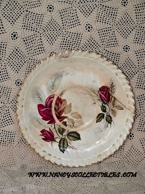 This is a saucer by Staffs Teaset Co., Ltd. It is decorated with red roses, trimmed in gold around the outer braided edge. It is in poor condition; no repairs. It has a hairline, 2 chips(one on the back and one small on the front. There is also crazing. It is marked StaffTeaset Co., Ltd.,Plex St.Pottery,Tunstall,Made in England. It measures 5-1/2" in diameter.