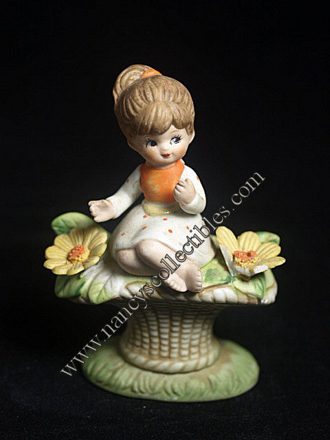 A figurine of a girl sitting in a basket of yellow flowers. It is in very good condition; no cracks, or repairs. One of the flowers has two of its petals missing and one chipped. It measures 4-1/2" tall, 2-1/4" wide. It is marked "2112".