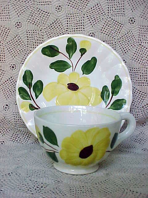 A beautiful Blue Ridge Pottery cup and saucer set in the "Yellow Nocturne" pattern in the "Colonial" shape. They are in excellent con- dition; no chips, cracks, or repairs. The saucer measures 6" in diameter. The cup mea- sures 3-3/4" in diameter; 2" in diameter at the base. They are unmarked. A great set!