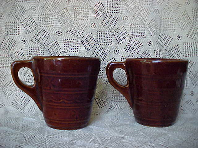 A set of two mugs by Marcrest in the "Daisy & Dot" pattern. They are in the dark brown glaze and are in excellent condition; no chips, cracks, hairlines, or repairs. They each measure 3-3/8" in diameter at the top and 3-1/2" tall. They are marked "USA".